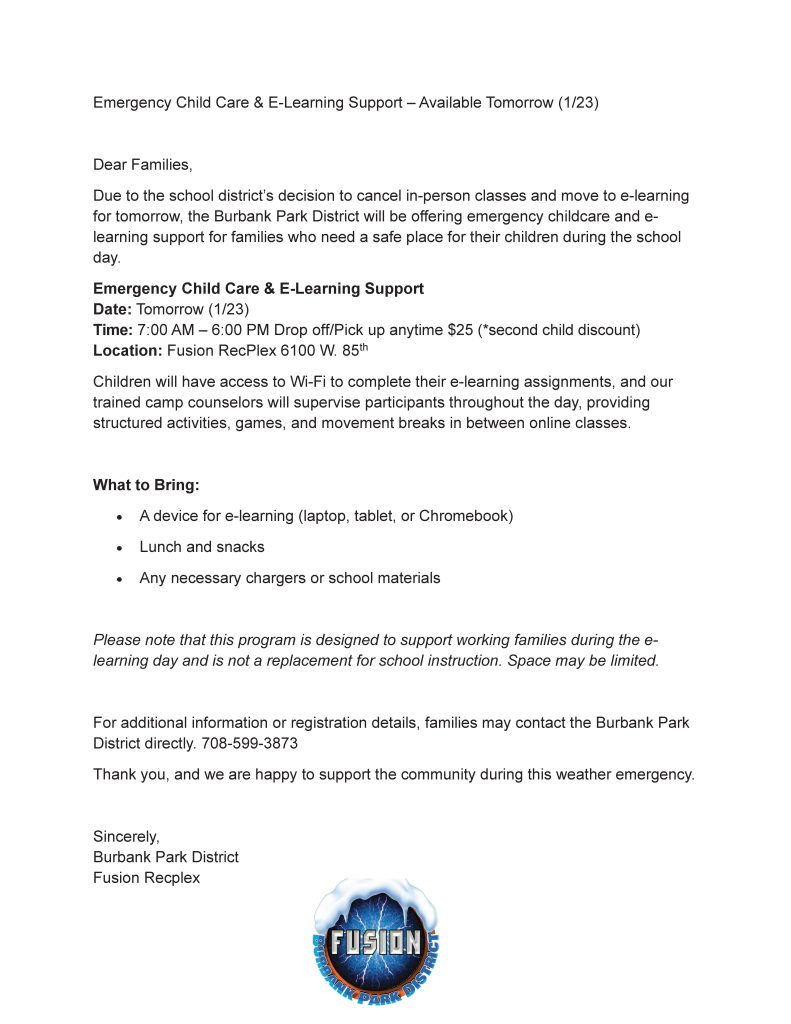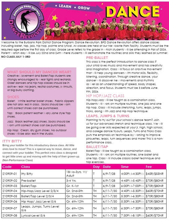 The Burbank Park District makes every attempt to print information that is current when the brochure is printed. However, the information in this brochure is subject to change at any time without notice. Please call our offices for up to date information and refer to activity/event receipts.