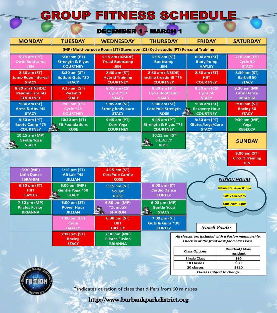 Special Classes & Hours for Holiday Season. Please call 708-599-3873 for the most up-to-date schedule on Holiday Weeks.